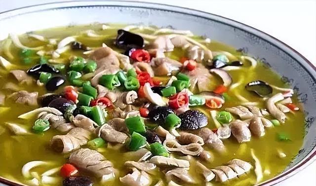 2、净锅放油烧热,下姜末、蒜末炒香后,倒入青椒汁并加盐和味精调味,放入土豆粉条、肥肠节、黄喉片和香菇块稍煮几分钟,淋藤椒油和香油便起锅装盘。